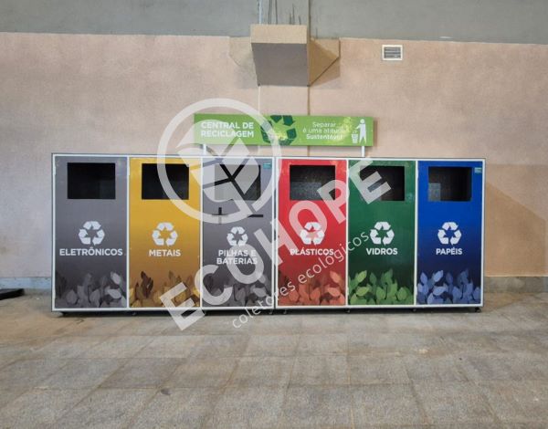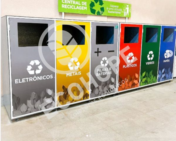 Ecoponto Modular Personalizável, PEV ponto de entrega voluntária, com refil de big bag em cada divisória ou bombona para os resíduos escolhidos. Acompanha amplo display para melhor comunicação visual, estrutura metálica interna para uma maior resistência e durabilidade. Fechaduras com porta cadeado. Personalize de acordo com sua necessidade.