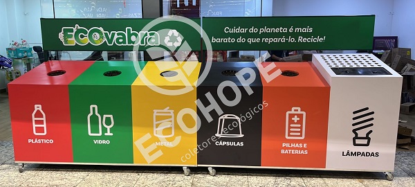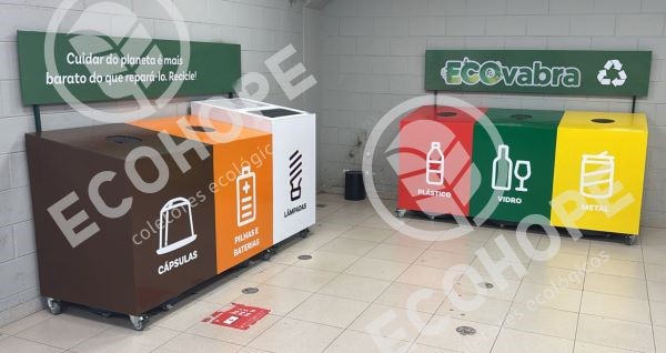 Ecoponto Personalizável Modular, PEV ponto de entrega voluntária, com refil de big bag em cada divisória ou bombona para os resíduos escolhidos. Acompanha amplo display para melhor comunicação visual, estrutura metálica interna para uma maior resistência e durabilidade. Fechaduras com porta cadeado. Personalize de acordo com sua necessidade. Personalizável em compartimentos e litragem. Arte inclusa de acordo com o projeto, opção de rodízios para fácil locomoção.