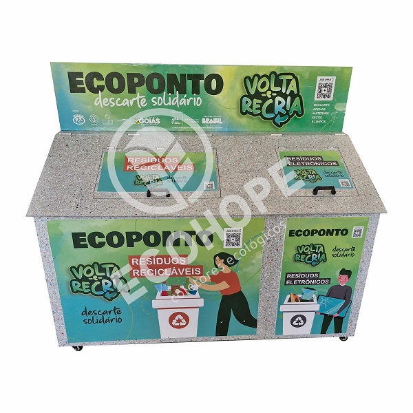 Os Ecopontos são locais de entrega voluntária de pequenos volumes. Disponibilizando os Ecopontos com o objetivo de destinar corretamente os resíduos, retirando-os de vias publicas, rios e terrenos baldios, que ocasiona desde problemas de saúde a enchentes, além aumentar os gastos com a limpeza pública. Levando os materiais recicláveis (papel, papelão, vidro e alumínio) para estes espaços e então encaminhados às centrais de triagem da cidade. Ponto de entrega voluntária personalizável.